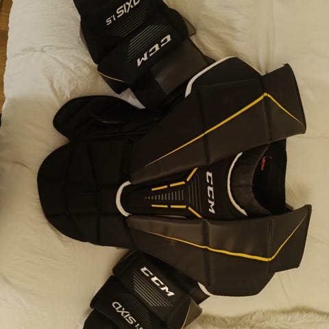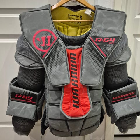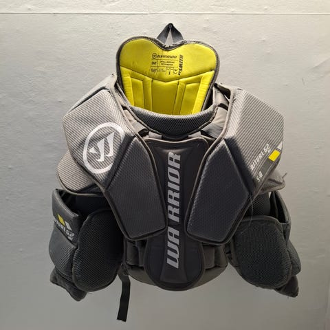 Käytetty maalivahdin hyväkuntoinen rintapanssari. Harrastesarjakäytössä ollut 3 kautta, ei päästä läpi. Kaikki remmit ja kiinnikkeet ehjät.