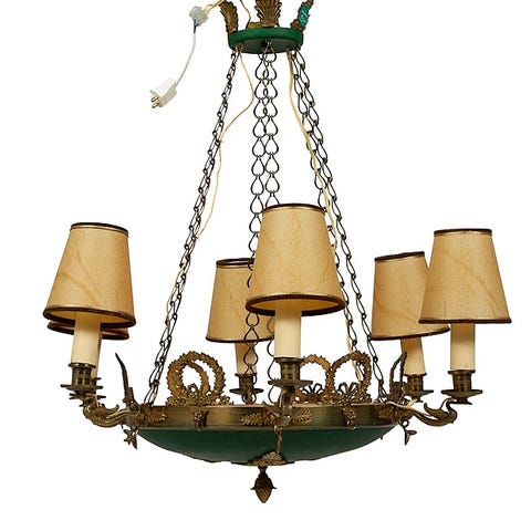 - Empire-tyylinen amppelilamppu, jossa valut ovat pronssia ja muuten messinkiä, valk. opaalilasikupu, 4 kpl kynttilälamppuja, joissa valk. silkkiset varjostimet, kork. 83 cm, lev. 42 cm, syv. 42 cm, hinta 210 e