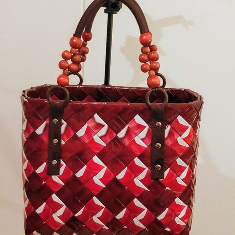 Kahvipusseista vahvennettu hakaketju tekniikalla punottu kassi, materiaali on taitettu 24 kertaiseksi, joten on vahva. Kahvat ovat tummat ja niissä on koristeellisia helmiä. Mitat: Korkeus 28 cm, pohja 16 x 31 cm. Sopii arkikassiksi tai ostos- tai asiointikassiksi. Nouto tai postikulut ostajalle.