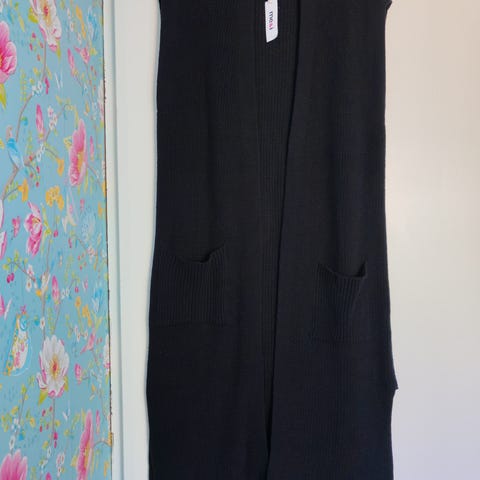 Kuin uusi musta neuleliivi. Koko XL. Merkki Sti. Materiaali 80 % viskoosia ja20 % polyamidia. Liivin pituus 73 cm ja kai-kai 52 cm. Liivissä kivoja yksityiskohtia: hihat, jotka voi tarvittaessa kääntää ja laittaa napilla kiinni (kuva) ja liivin edessä 8 nappia, joista osa koristeena, 5 nappia olen pitänyt kiinni (kuva). Liivin musta väri hyvinsäilynyt. Vesipesu 30 ° ja silitys yhdellä pisteellä.
