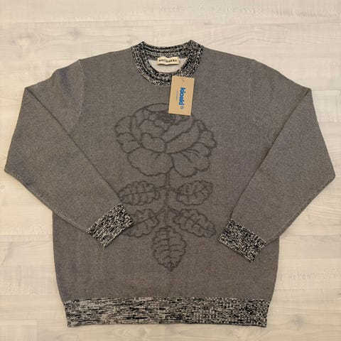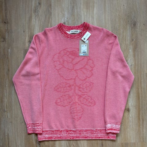 Myynnissä käyttämätön Marimekon Lasi Vihkiruusu puuvillaneule. Väri on vaaleanpunainen, resorit ovat puna-valkoiset.