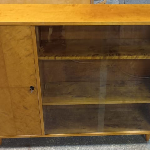 Puinen (koivu) vitriinikaappi + kirjakaappi, jossa lasiovet ja kirsikkavärinen viimeistely. Kaapissa on useita hyllyjä kirjojen ja esineiden säilytykseen. Sopii olohuoneeseen tai kirjastoon. Vitriinikaapissa on valaistus.
