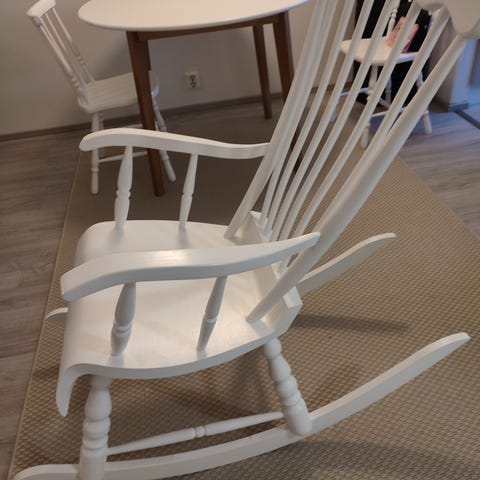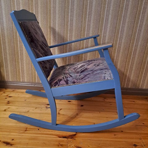 Vanha söpö pieni puinen keinutuoli, istuin ja selkänoja verhoiltu. Puuosat maalattu aikoinaan ja maali vähän rapistunut, joten on pienen laiton tarpeessa.