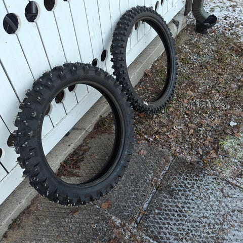 Duro heavy duty 3.50-19 piikkirenkaat. Kaikista yksittäisiä piikkejä lähtenyt