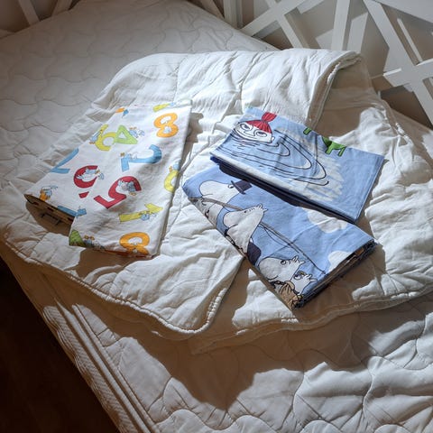 Noin 10 yötä nukuttu junioripeitto ja siihen sopiva pussilakana + alulakana settinä.