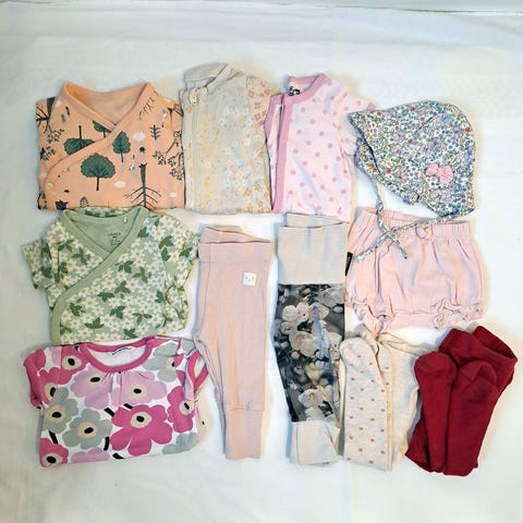 Iso pikkuvikainen vaatesetti. Koko 50-74, mutta suurin osa kokoa 62 tai 68. Tytölle. Vaatteissa voi olla pientä tahraa, nukkaa tai haalistumaa. Mielestäni vielä sopivia vähintäänkin kotikäyttöön tai varalle. Osa moitteettomia.