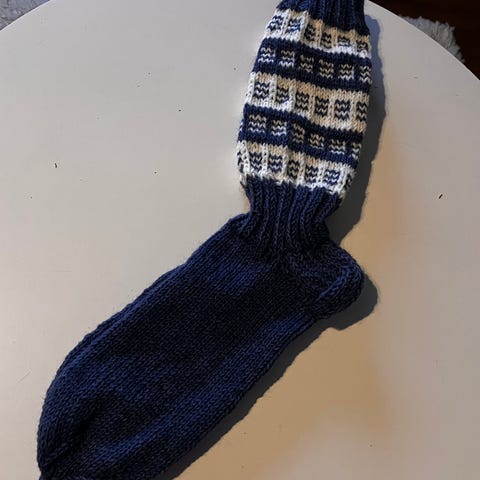 Käsin neulotut villasukat oranssissa värissä, koko 38-39. Sukat on valmistettu villalangasta ja niissä on kuvioitu varsi. Sopivat käytettäväksi kylminä päivinä jalkojen lämmittämiseen.