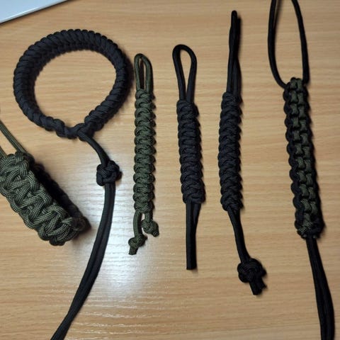 Moniväriset paracord-rannekorut, joissa on muovinen solki ja pieni kompassi. Mukana useita mustia ohuita naruja, jotka soveltuvat esimerkiksi kiinnitykseen tai pieneen sidontaan.