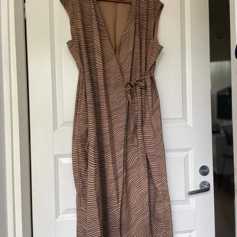Marimekon Hulda Näkki -tunika koossa L. Villasekoitetta. Niskassa vetoketjukiinnitys, edessä helmassa halkio. Kai-kai noin 56 cm, pituus noin 85 cm.
