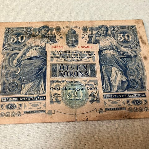 Itävalta-Unkari 50 kruunun seteli vuodelta 1914. Seteliä käytettiin myöhemmin Tsekkoslovakian tasavallassa väliaikaisena valuuttana vuonna 1919. Kuvanmukaisessa kunnossa, taitos keskellä, reunoilta repaleinen.