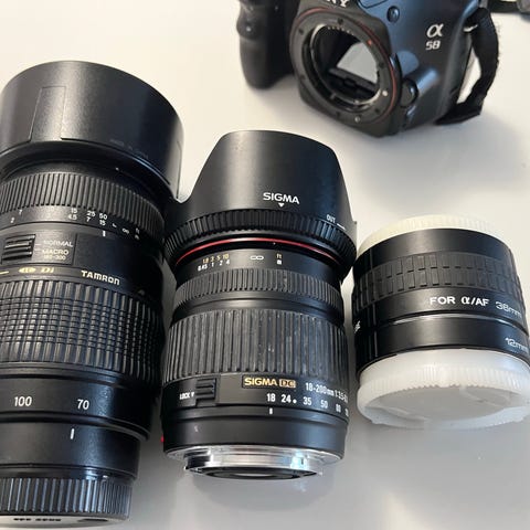 Siistikuntoinen hyvin pidetty, ehjä ja toimiva paketti. Sis. Kamerarunko, Sigma 17-70mm zoomobjektiivi, Sony hvl-f42am salamalaite, laturi ja akku ym.
