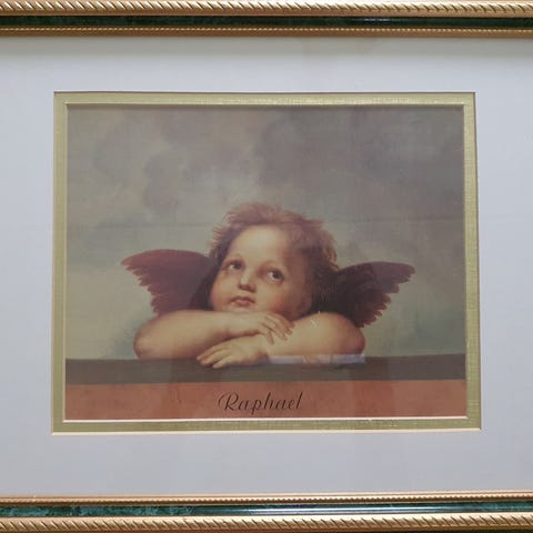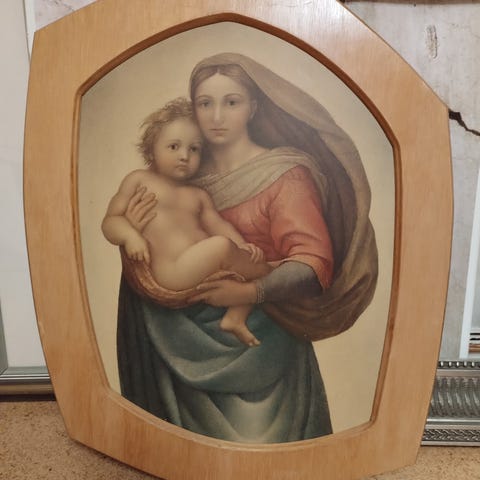 Erittäin hieno, Massiivisin raamein Italialaisen L Pisanin maalaama Rafaelin Madonna. Taulu krakkelointia myöden aivan esikuvansa näköinen. Öljyvärityö kankaalle. Koko raameineen n. 105 x 140 cm. Vaikuttava ja erikoinen teos.