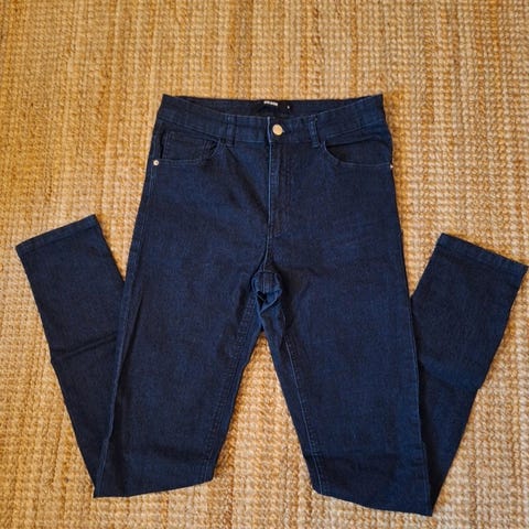 Olen käyttänyt näitä yhden pitkän illan alkuillasta aamuyöhön, joten lähes uudenveroiset, paitsi että olen itse lyhentänyt näitä aika heikoilla taidoillani. Otan lyhentämisen hinnassa huomioon. Muuten napakasti istuvat, mutta lahkeet levenevät jonkin verran. Kangas on kivasti joustavaa. Maksoivat ostaessani Bik Bokissa yli 70 €. Tiedän, että oli liikaa, mutta oli kiire saada housut. Pituus vyötäröltä lahkeensuuhun on noin 94 cm ja vyötärönympärys noin 71 cm, mutta myös vyötärökaistale joustaa hyvin ja menee mainiosti 78-senttiseen vyötäröön. Niitit ovat normaalin pronssin väriset, vaikka näyttävät kuvassa oransseilta.