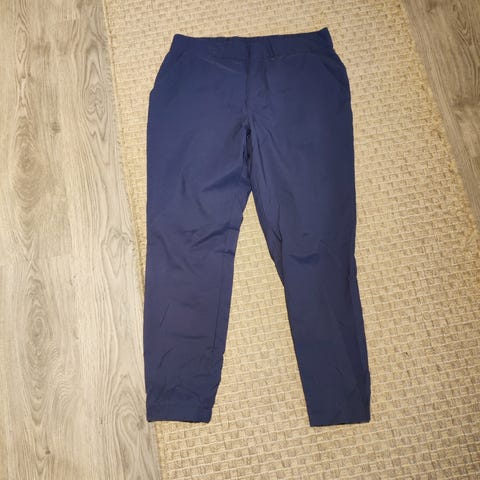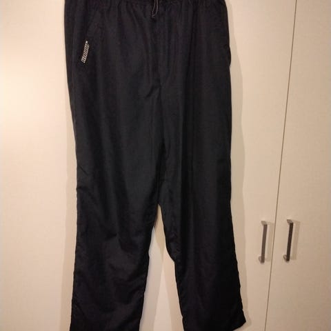 Tummansiniset vuorelliset tuuli-/ulkoiluhousut. Koko L joka pitänee paikkansa. Liukas vuori koko matkalla. Sivusaumoissa taskut. Merkki Creblet. Mittoja kuvissa.