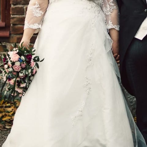 Puku on ostettu Lovebirdsilta, mutta jäi itselläni kokonaan käyttämättä, sillä päädyin lopulta toiseen mekkoon. Mekossa on pitsinen yläosa, helmikirjailtu vyötärö ja laskeutuva helma. Takana vetoketju ja pieni hakanen. Puvussa on edessä pieni hailakka jälki sekä sisäpuolella myös pieni jälki (näistä kuvat ). Muuten erinomainen kunto ja täysin käyttämätön minun osaltani. Mukana pukupussi.