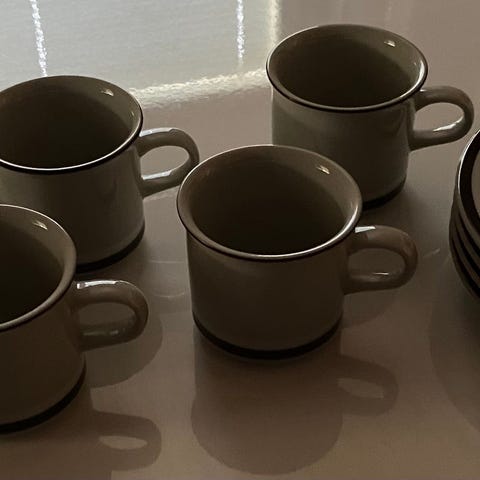 Myydään 2 kpl Arabia Hilppa kahvikuppeja aluslautasineen sekä 6 kpl kakkulautasia (17,5 cm). Oikein hyväkuntoiset, vähäisiä käytönjälkiä.