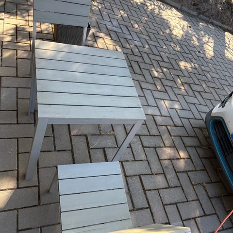 Taitettava puinen puutarhasetti. Kuluneet mutta käyttökelpoiset. Koko setti 50€.