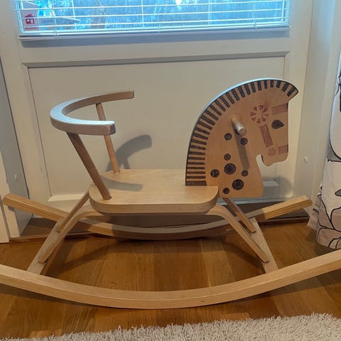 Uniikki puinen keinuhevonen. Osat hienosti hiottu.
