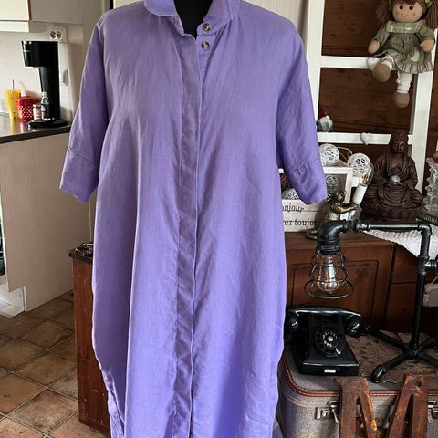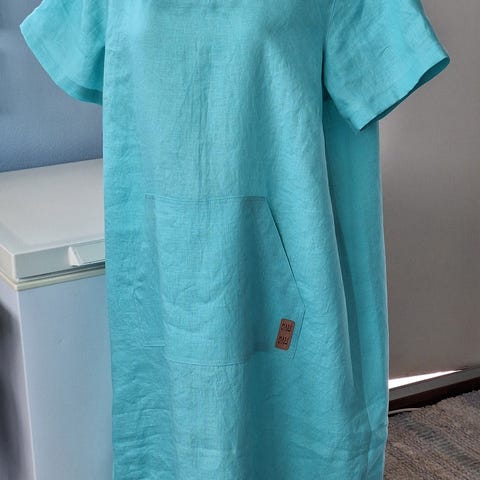 Vaaleansininen pellavatunika/mekko, 100% pellavaa. Mitat kai-kai 58,5 cm, olka-helma 84 cm. Edessä taskut, taskujen suulla hopeanväristä koristusta. Vähän käytetty, kunto erinomainen (tosin ryppyinen). Hp 30€, postikulut ostajalle tai nouto Lempäälä/Tampere.