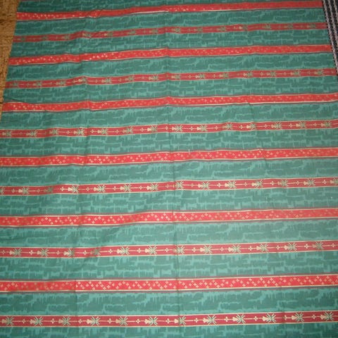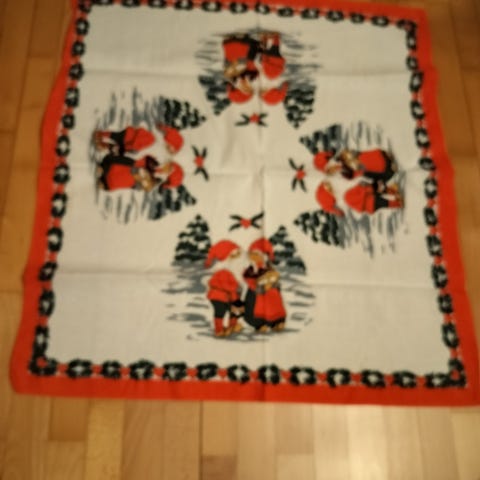 Joulupöytäliina, jossa on punaisia ja valkoisia kuvioita. Symmetrinen neliön muotoinen, 80x80 cm. Pöytäliina sopii koristeelliseksi kattaukseen ja kodin sisustukseen.