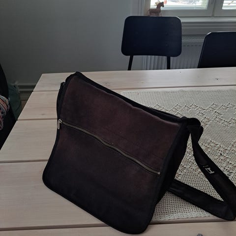 Laukku on n. 10 vuotta sitten ostettu. Mallin nimi on Rita Varvunraita. Design Anna Werneri, kuviosuunnittelija on Vuokko Eskolin-Nurmesniemi. Markiisikangasta ja nahkaa. Sisätaskuja ja yksi vetoketjulla suljettava sivutasku. Käytetty alle 10 kertaa. Nouto sopimuksen mukaan Lahden Ankkurista, maksu käteisellä.