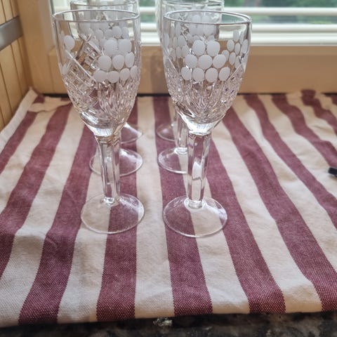 4kpl pienet kristallilasit. Tilavuus 0,5dl. Ehjät ja siistit lähes käyttämättömät.