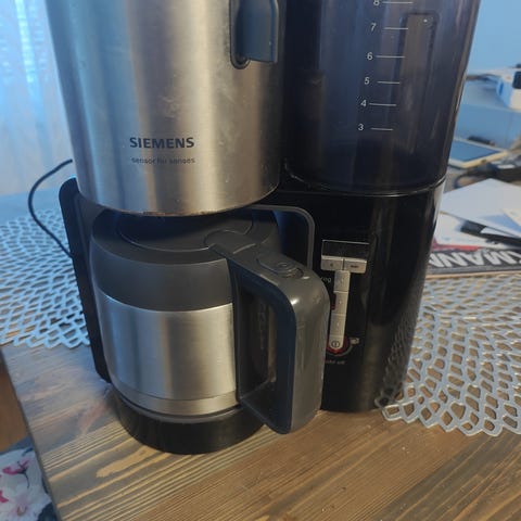 Kahvinkeitin on toimiva. Kahvipannun nokkaa on jouduttu korjaamaan, mikä näkyy kuvassa.