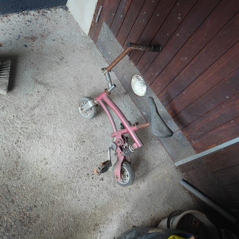 Fleur polkupyörä, jossa 22 tuuman kiekot. Runko on valmistettu teräksestä ja pyörä on violetti. Takarengas vaatii korjausta.