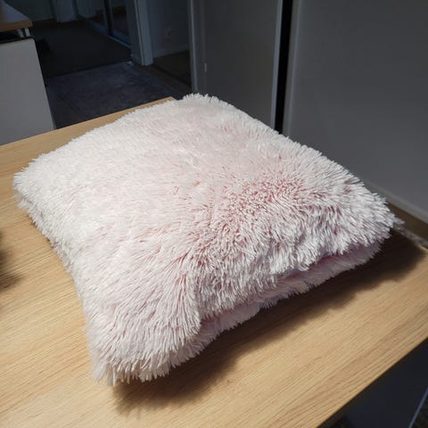 Pörröiset koristetyynyt, 2 kpl. Vaalea roosa, tyynyn koko 40 x 40 cm (44 x 44 cm). Päällisissä vetoketjut, toinen puoli pehmeää miellyttävää materiaalia. Hinta 10 eur/kpl.