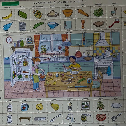 Palapeli Learning English Puzzle 4. Mitat 28,5 cm x 36,5 cm. Moitteeton kunto. Heinämäessä Palokassa. Hinta 5e.