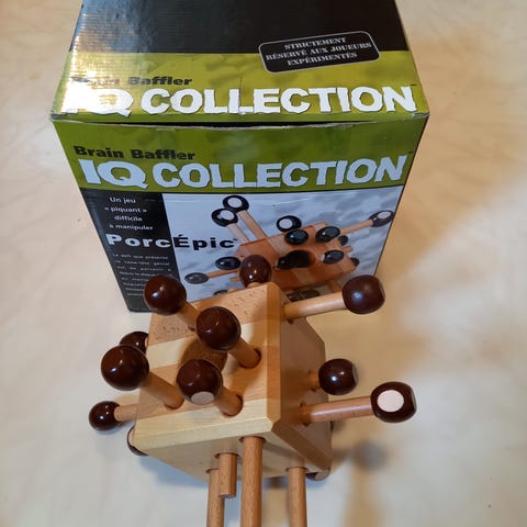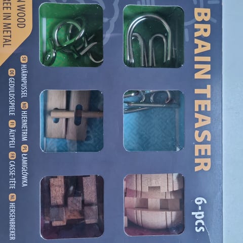 Myydään uusi Brain Games Pulmapelit 5 in 1" -niminen tuote, joka sisältää viisi erilaista puista ja metallista valmistettua pulmapeliä.