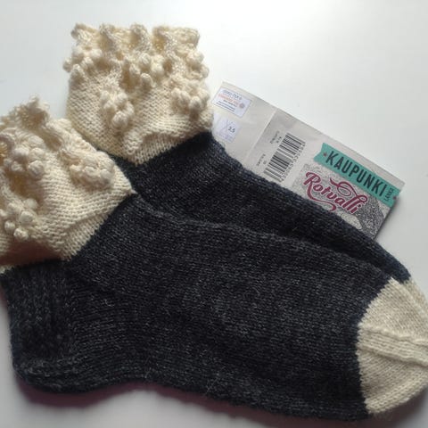 Kaupunki Rotvalli-langasta neulonut villasukat koko 37-38. Jalkaterän pituus 25 cm ja varren pituus n. 12 cm. Malli on Nina Laitisen Häävalssi. Postimaksun maksaa ostaja.
