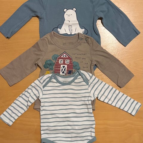 Myydään pakettina 3 bodya koossa 62-68. Värit vähän haalistuneet. Punaiset bodyt menivät meillä vielä koossa 74.