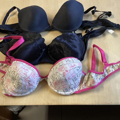 Käyttämättömät, vain sovitettu, laput kerkesin leikata pois. Koko D 105. Kaarituet, kiinnitys neljällä hakasella. Ohuesti vuoratut pitsisomisteiset kupit. Sivuissa hieman joustava sileä kangas.