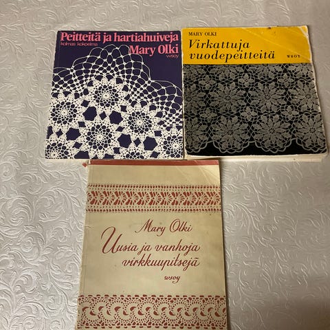 Myyn virkkausmallikirjat kolme kpl.Uusia virkkausmalleja14, 5€, Uusia virkkausmalleja 15, 5€ ja Virkattuja pikkuliinoja 5€. Kaikki kolme yhteensä 10€+postikulut.