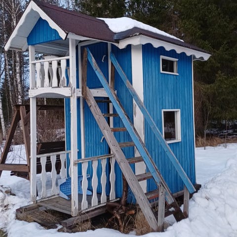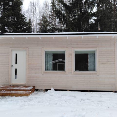 Mukana saa kaikki ovet, ikkunat, kattopellit jne. eli koko mökin.