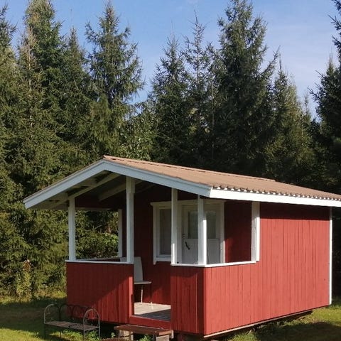 Mökissä on lautavuoraus ulkona ja sisäseinissä on levyt.