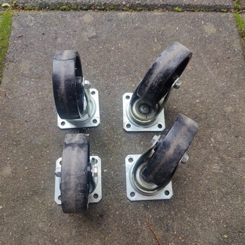 Uudet, käyttämättömäksi jääneet kääntyvät pyörät. 2 kpl on jarrullusta.