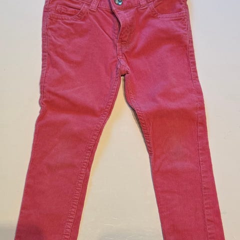 Play Zone -merkkiset housut, joiden pinta muistuttaa vakosamettia. On olleet käytössä ja pinnassa erityisesti polvissa kulumaa (kuva). Tuotelapun takapuolella nimikointi näkyvissä.