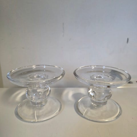 Kaksi kirkasta lasia olevaa kynttilänjalkaa.