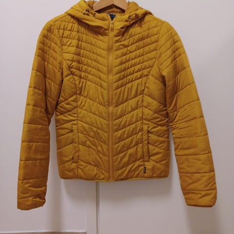 Keltainen, pehmyttä kangasta. Kevyt toppainen syys/välikausitakki