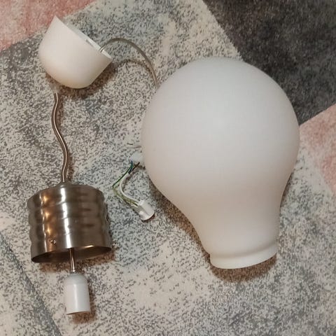 Riippuvalaisin, jossa läpinäkyvä valkoinen varjostin ja lasikoristeet. Valaisimessa on 5 E14 lamppukantaa. Sopii sisätiloihin, ollut lemmikkitaloudessa. Osa lampuista kaipaa uusimista. Mukana valaisinpistotulppa.