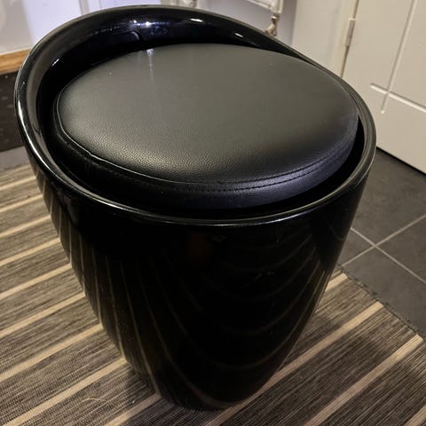 Musta metallirunkoinen penkki/ pöytä nahka (?) -verhoilulla. Tämä modernin pelkistettyä muotoilua, sopii moneen sisustukseen.