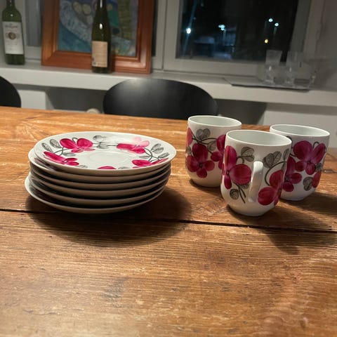 Myydään Arabian astiastoa, jossa sinivalkokultaiset yksityiskohdat. Tällä luo kauniin kattauksen.