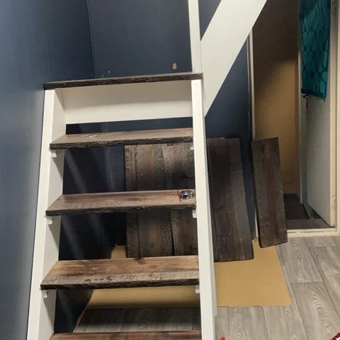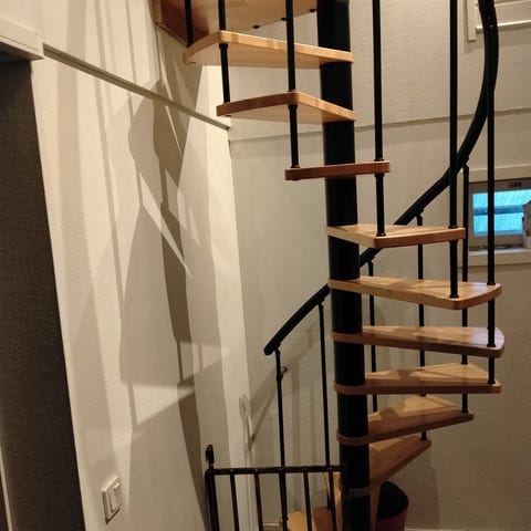 Puiset portaat tummat askelmat ja valkoinen runko. Tuppeensahatusta haavasta