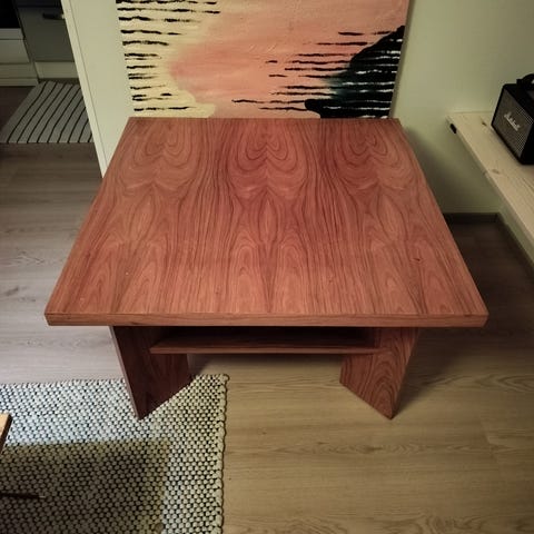 Siisti ja tukeva sohvapöytä, johon painonsa tähden asennettu pyörät siirtelyn helpottamiseksi. Ne kasvattavat pöydän korkeuden 50 cm --> 56,7 cm. Pöytä öljytty vernissalla parin kolmen vuoden välein - nyt kaipaa taas öljyämistä. Pöydän pinta täysin siisti, jaloissa muutama kolhu, jotka helposti hiottavissa pois. Tästäkö käytännössä ikuinen pöytä sinun olohuoneeseesi?