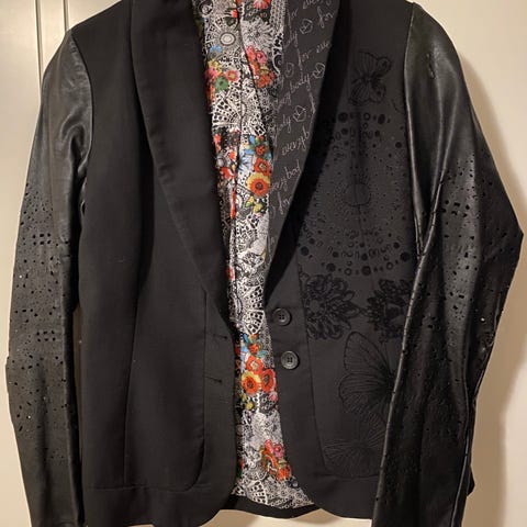 Desigual naisten takki, väri musta, koko 40. Takissa on teksturoitu pintamateriaali ja sisäpuolella kuvioitu vuori. Eläintalous.