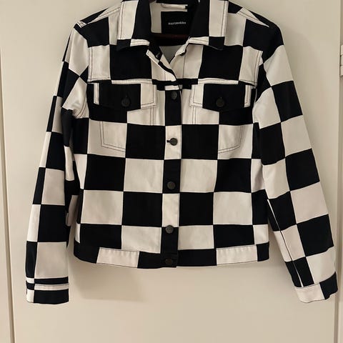 Marimekon ihana mustavalkoruudullinen kukko & kana luonne pitkä farkkukankainen takki.