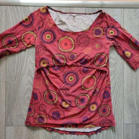 Pitkänmallinen imetyspaita/tunika. Käy jo odotusaikana, kangas joustavaa trikoota. Koko XS, menee myös S-kokoa käyttävälle. Kangas nukkaantunut, kuitenkin ehjä ja ainakin kotikäyttöön sopiva paita. Pesty hajusteettomasti, eläimetön talous. Nouto tai postitus osana isompaa pakettia, en postita tätä yksinään.