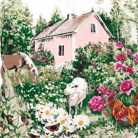 Väri kirkkaan vaaleanpunainen ja mustavalkoinen kukko-kuvio.